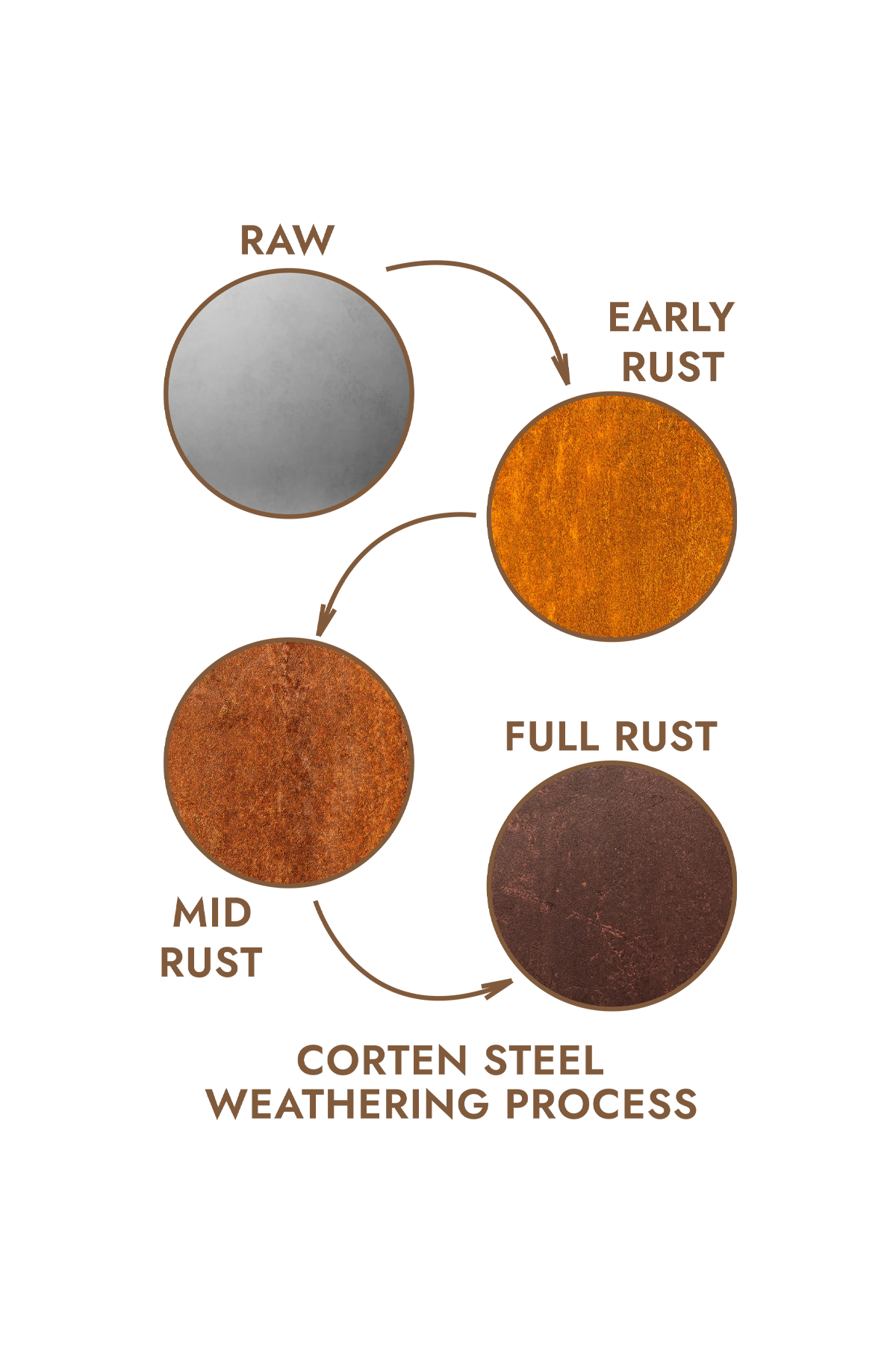 Each Corten Steel product is shipped with its natural mill finish. Once exposed to outdoor elements, it begins a gradual oxidation process that evolves over time-from a bright orange hue to a deep, earthy brown. Factors like humidity, air salinity, and local climate influence how quickly and evenly this patina forms, making every piece unique.